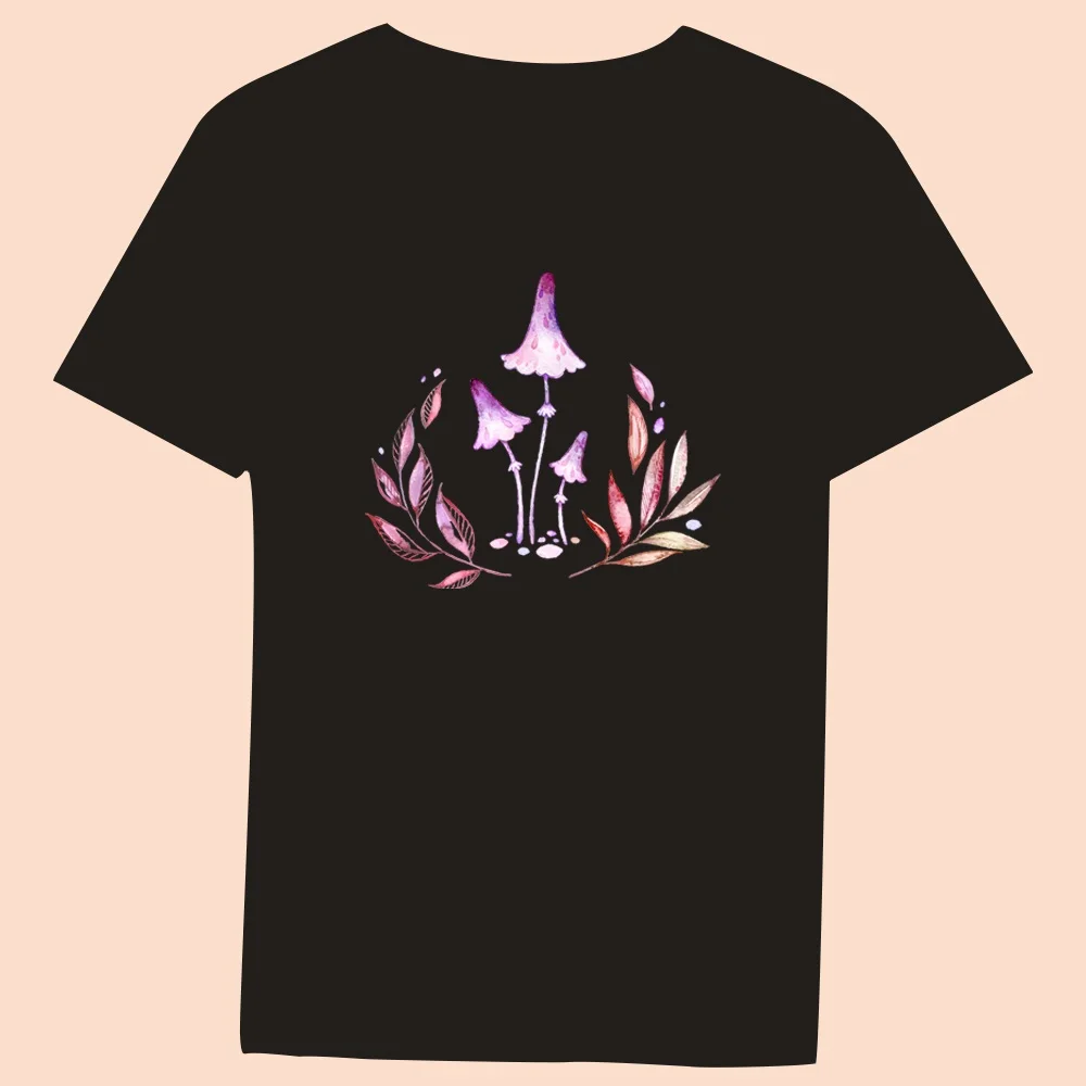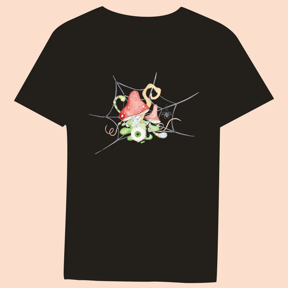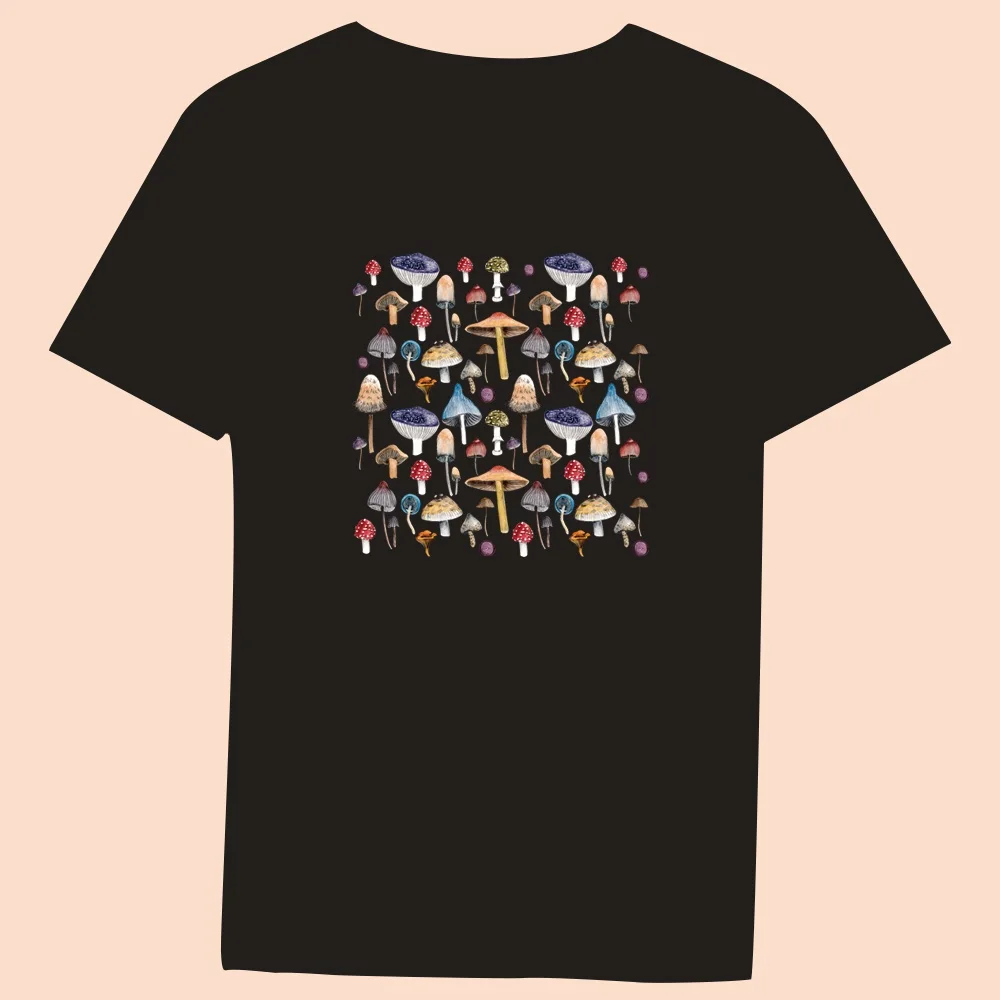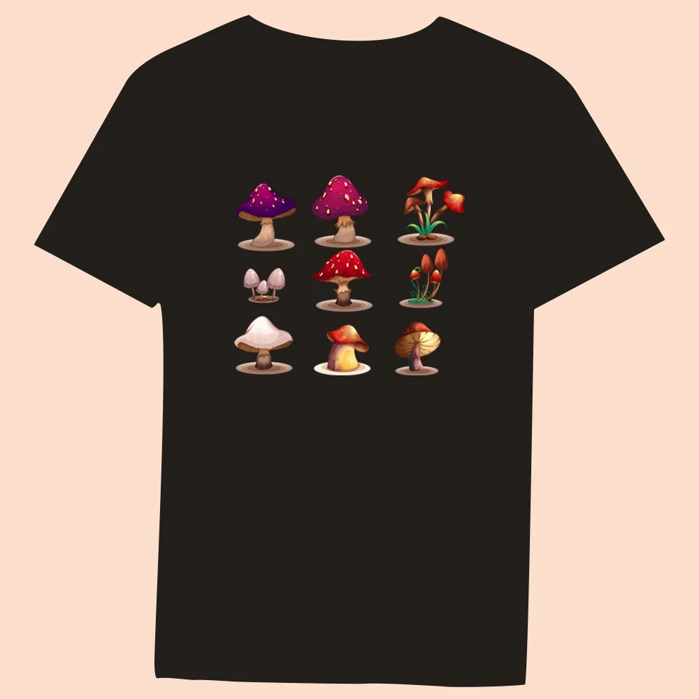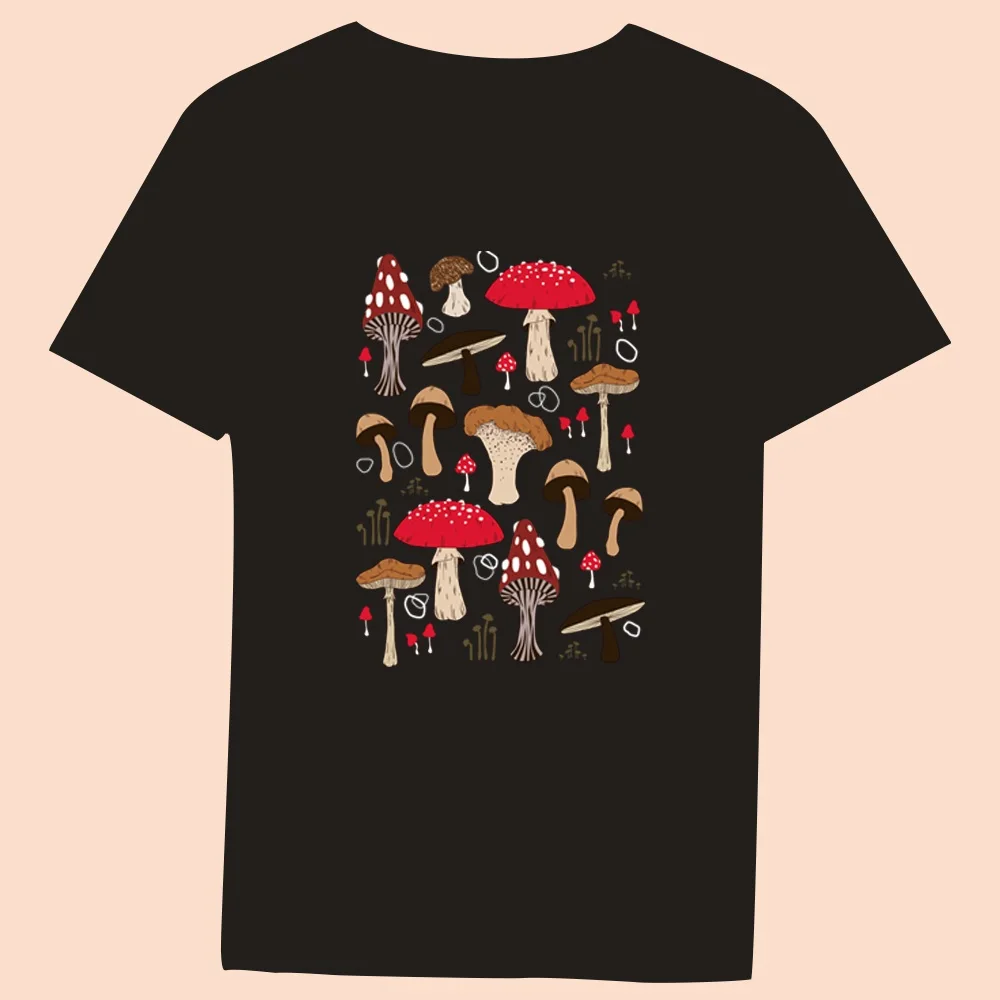 2024 Hot Sale Women’s Black T-Shirt Casual Top Mushroom Print Series Round Neck Ladies Slim Fit Commuter Short Sleeve Ladies