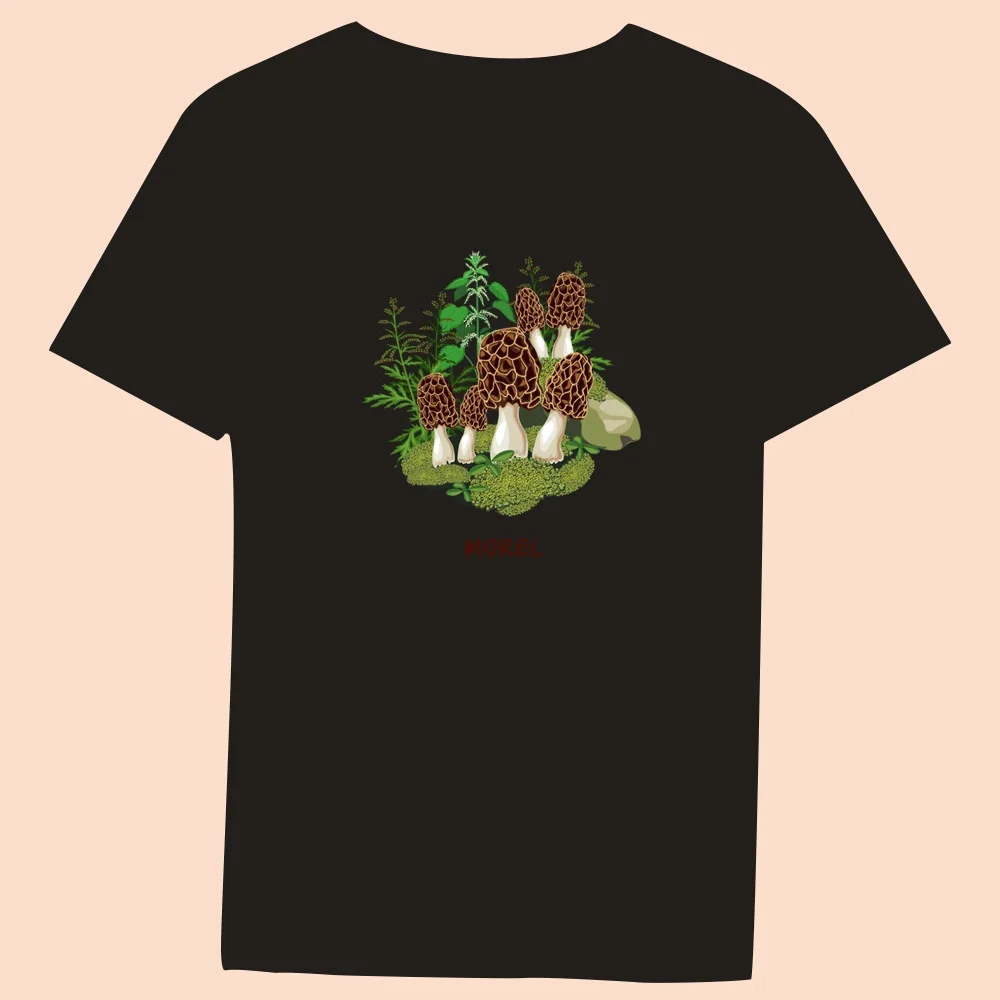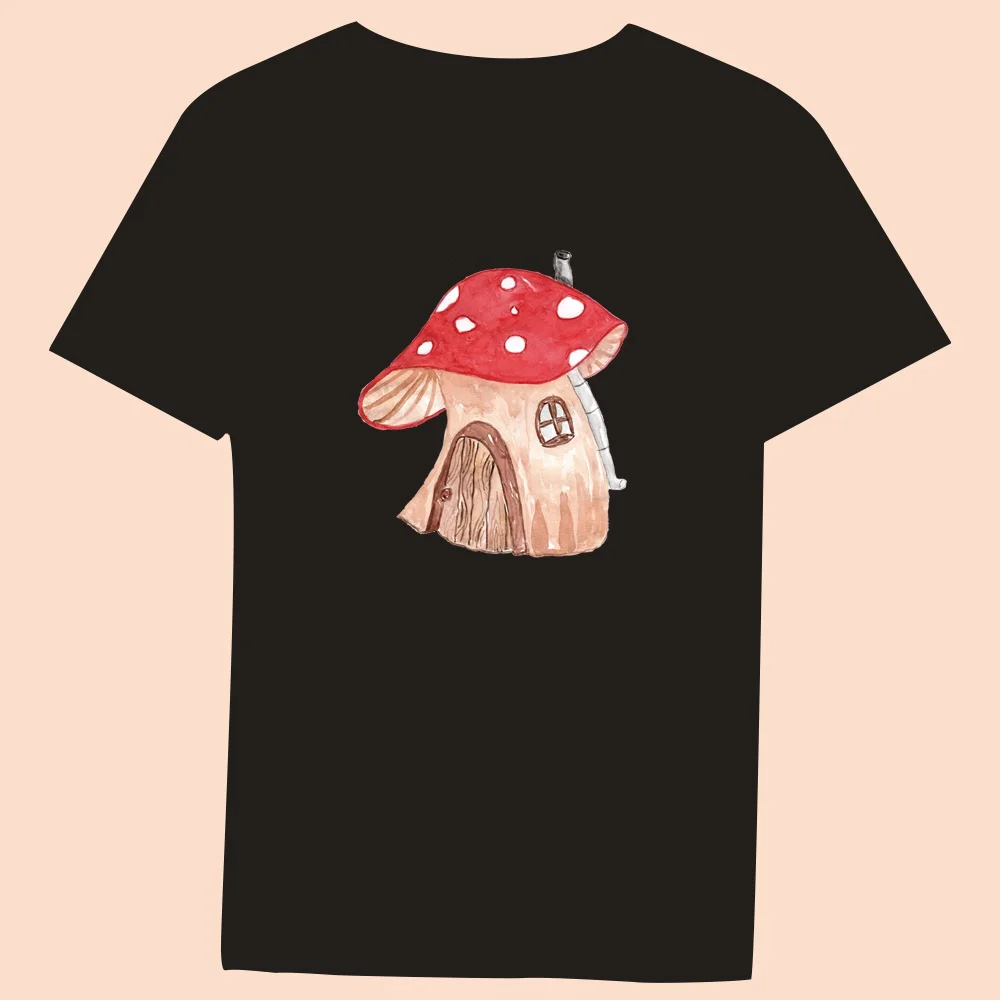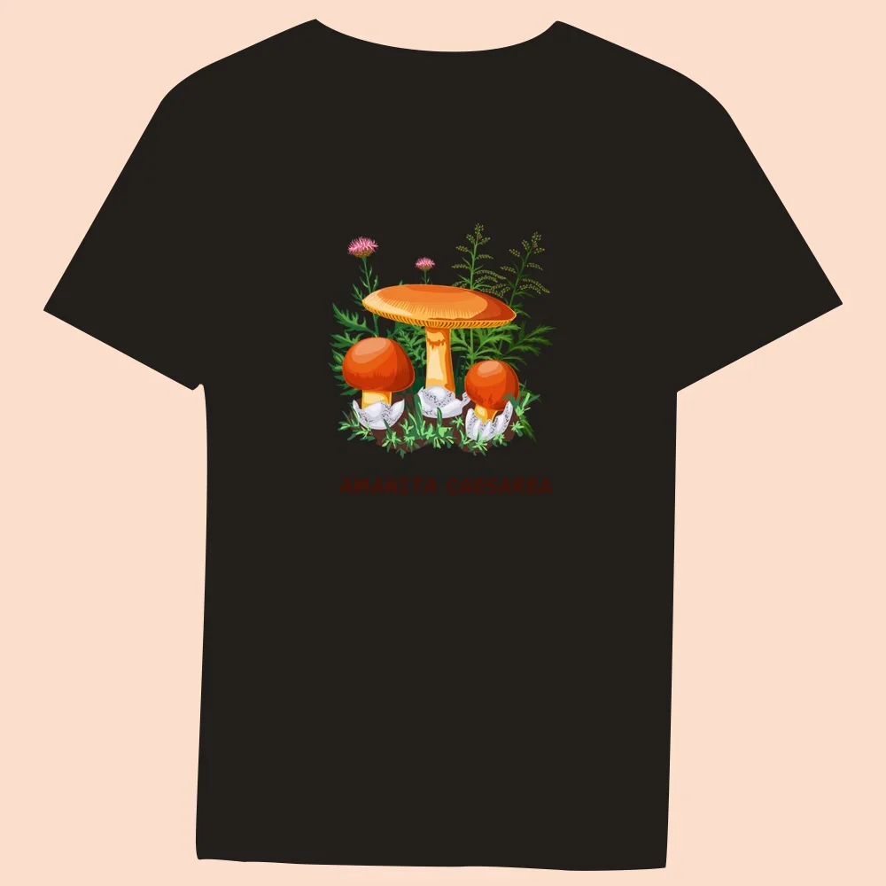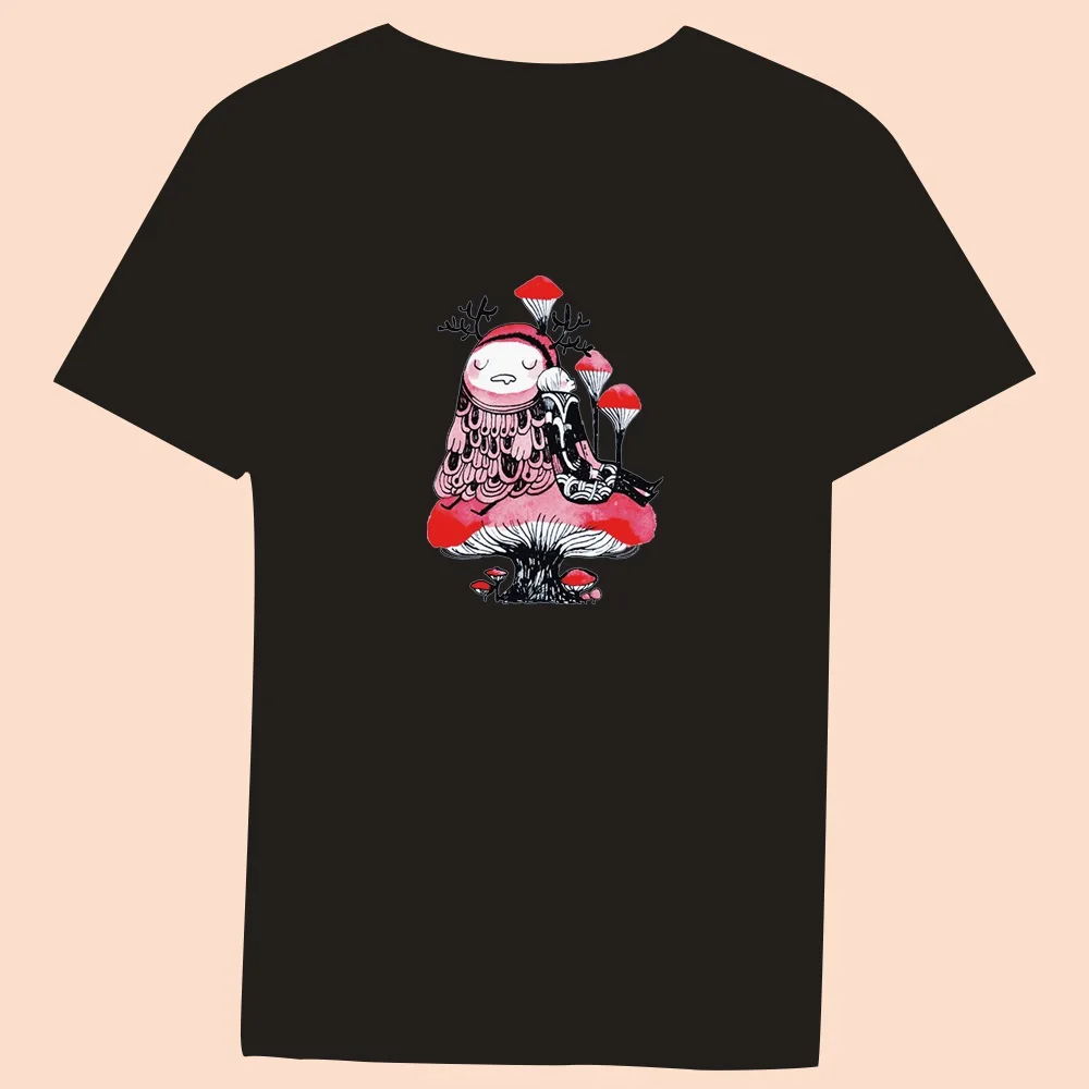 2024 Hot Sale Women’s Black T-Shirt Casual Top Mushroom Print Series Round Neck Ladies Slim Fit Commuter Short Sleeve Ladies