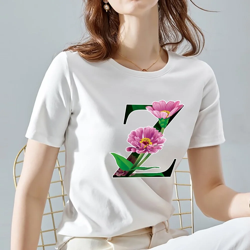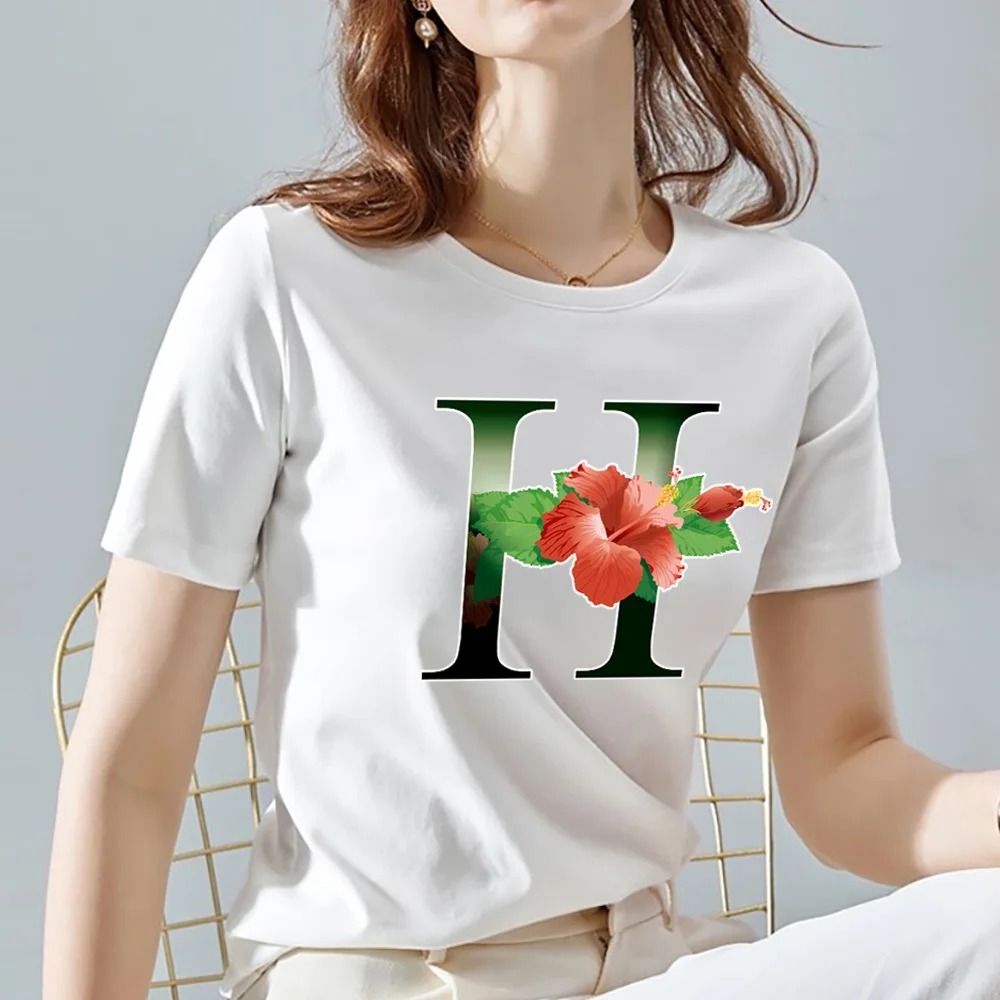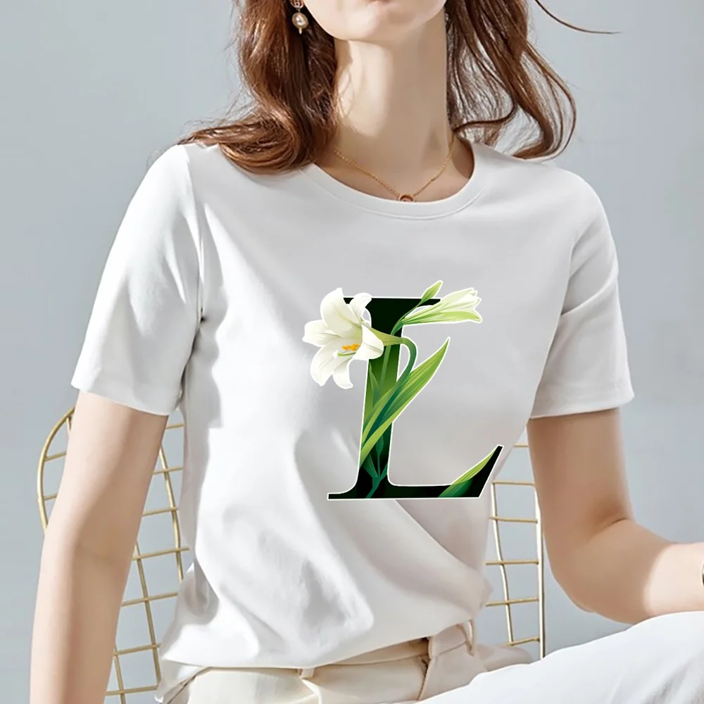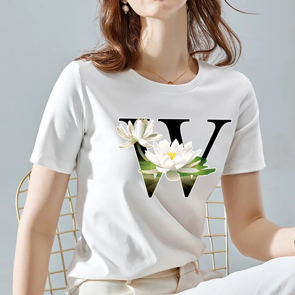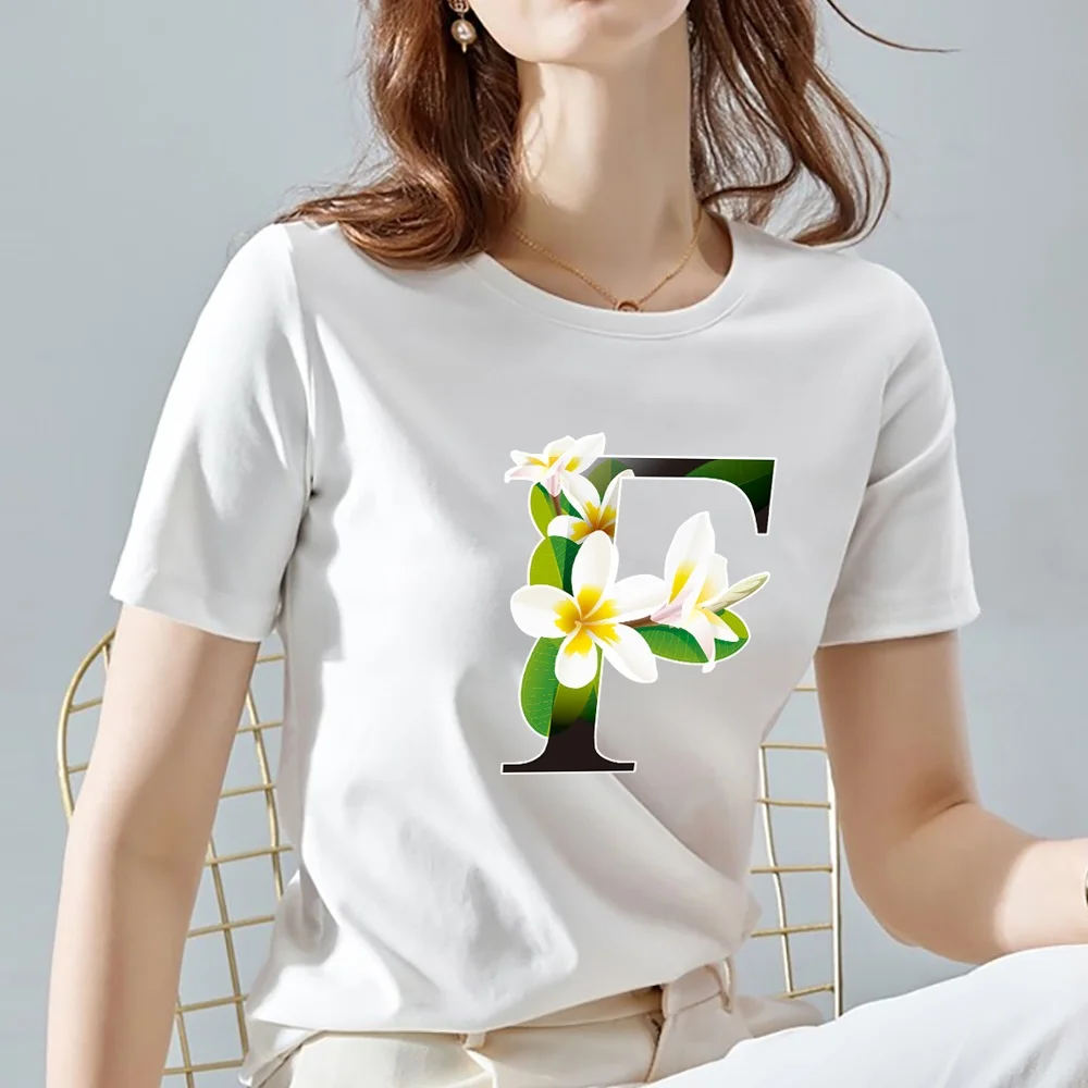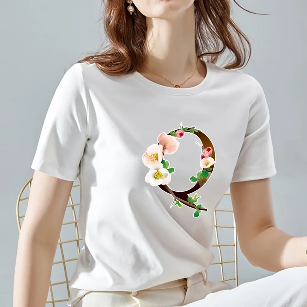 O Neck White Top Women 2022 Summer Casual T Shirt Basic Flower Color Letter Name Pattern Print Short Sleeve Tops Ladies Clothes