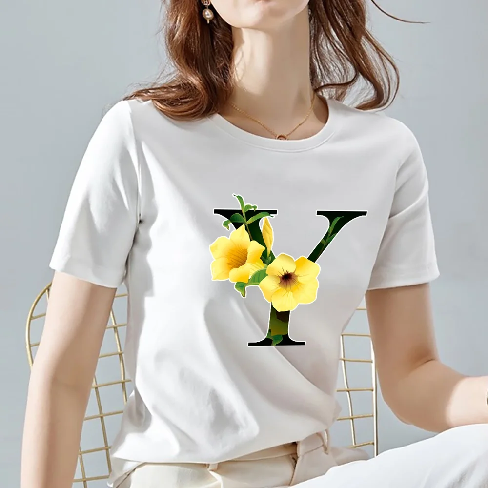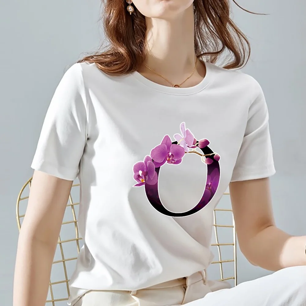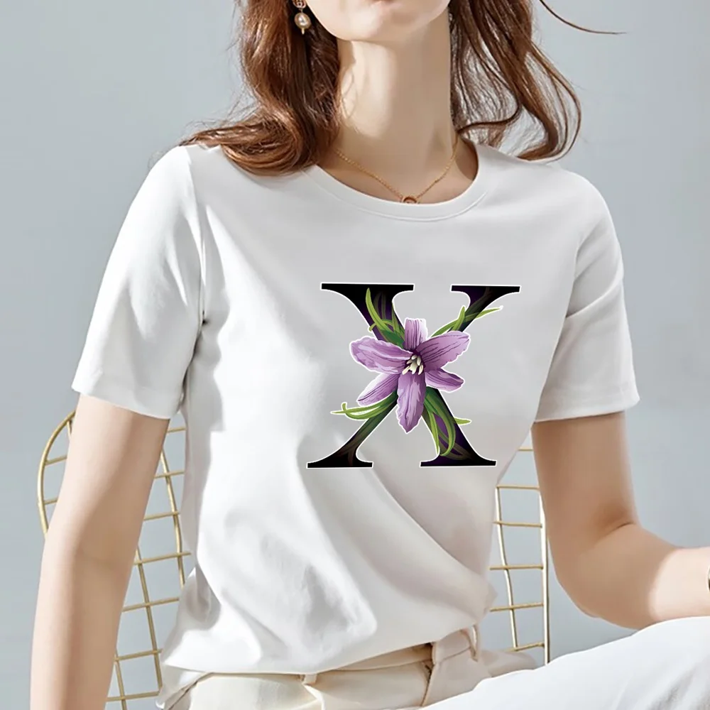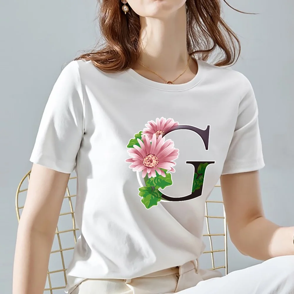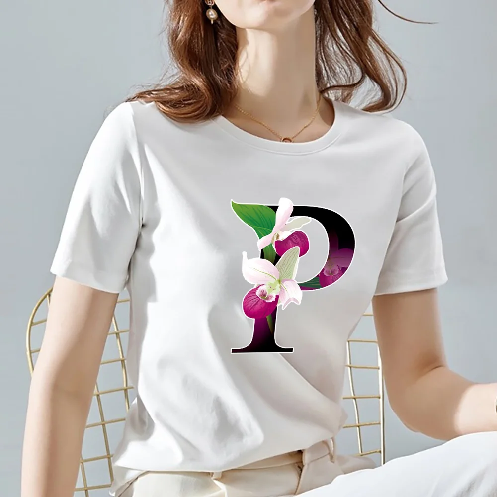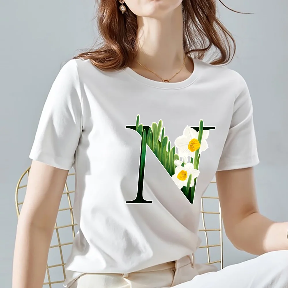 O Neck White Top Women 2022 Summer Casual T Shirt Basic Flower Color Letter Name Pattern Print Short Sleeve Tops Ladies Clothes