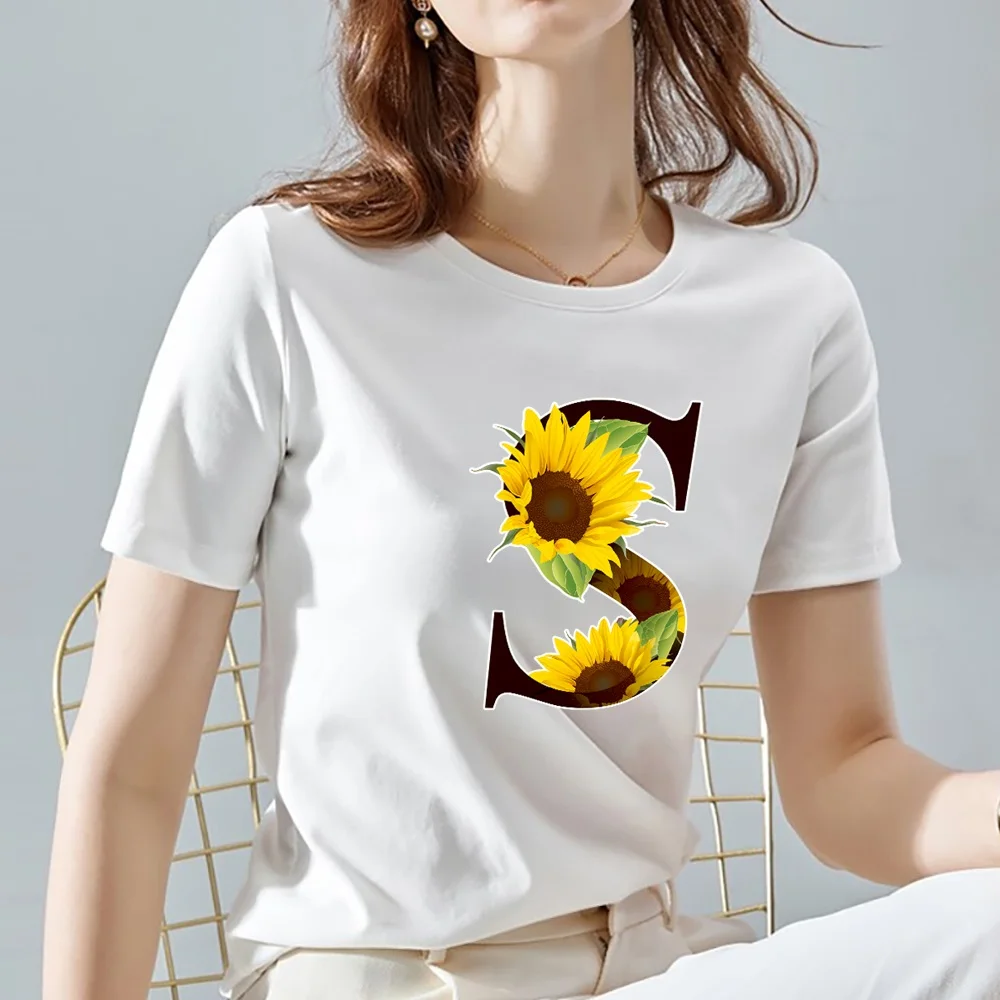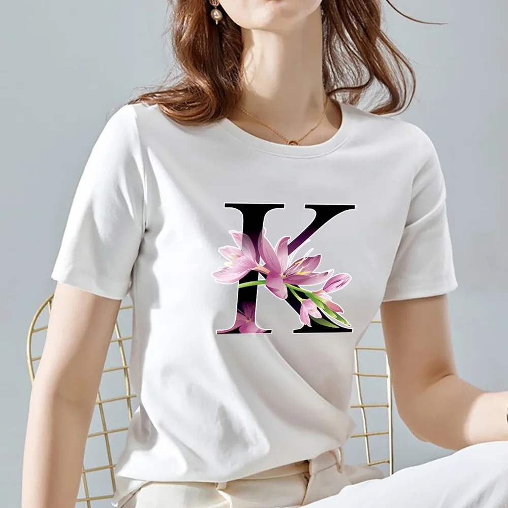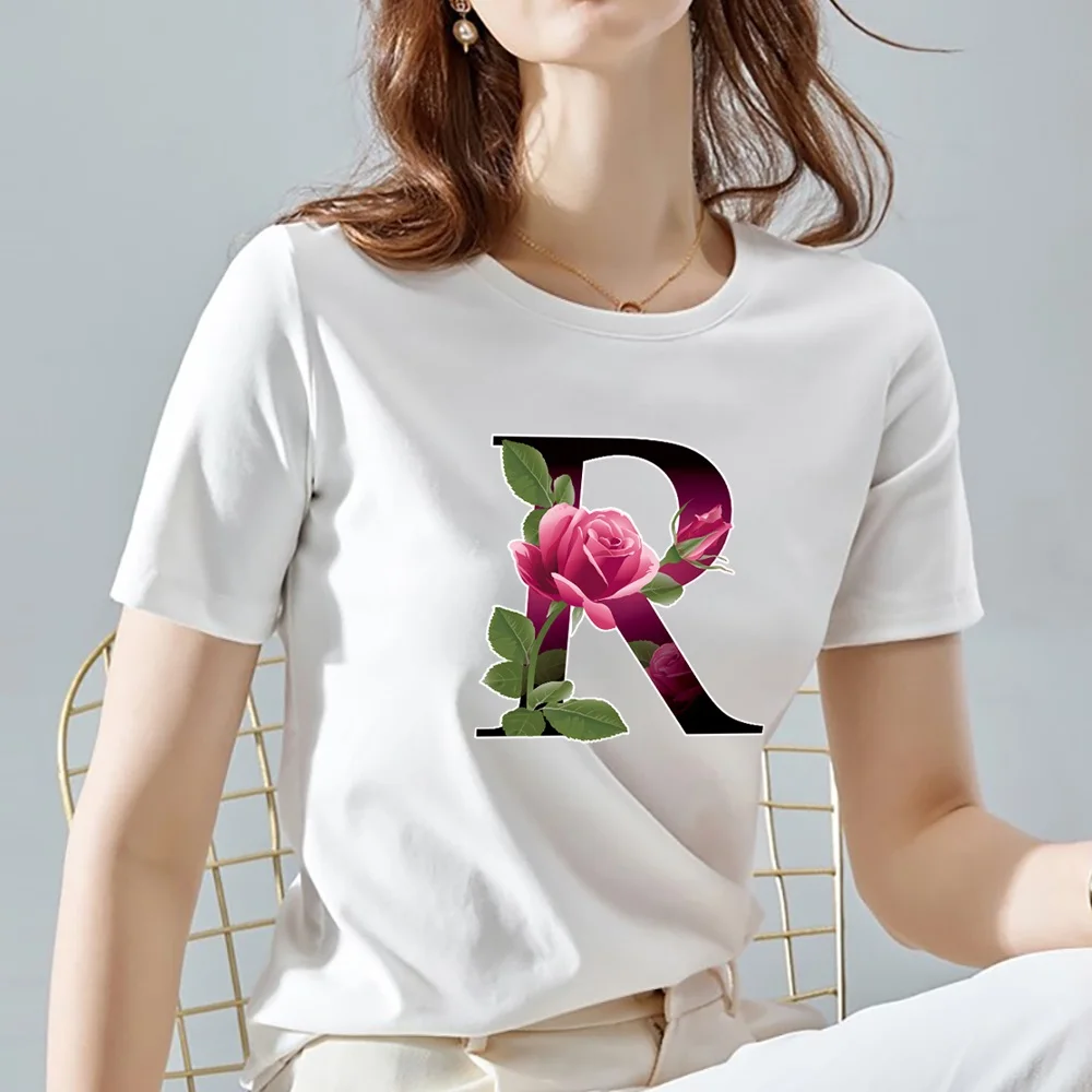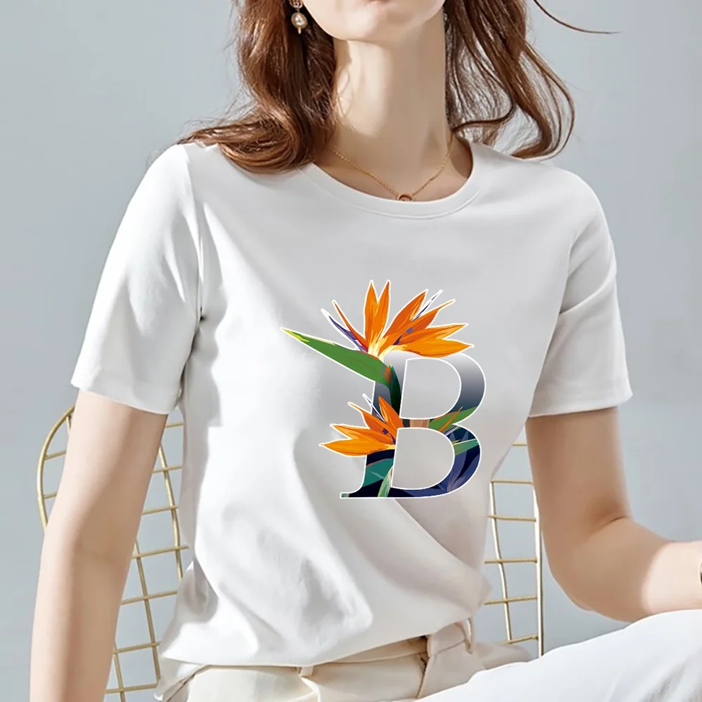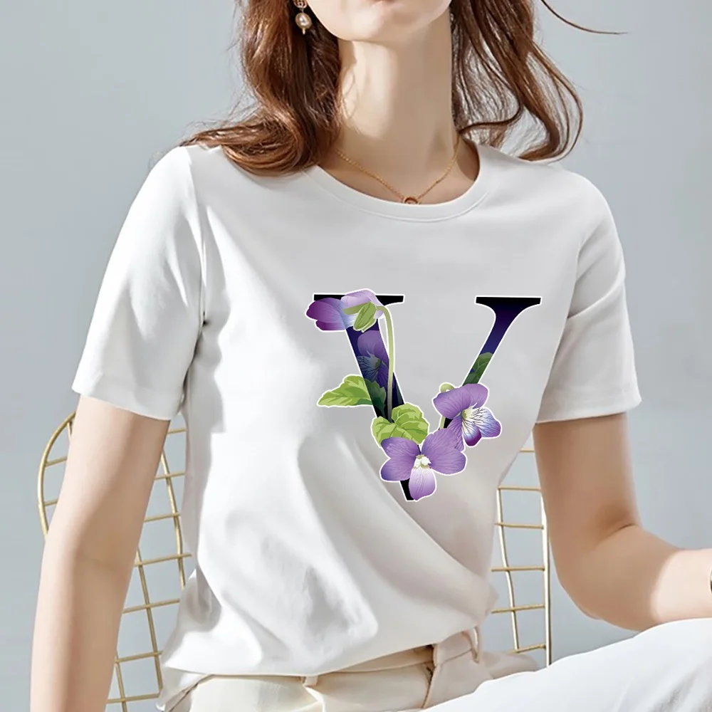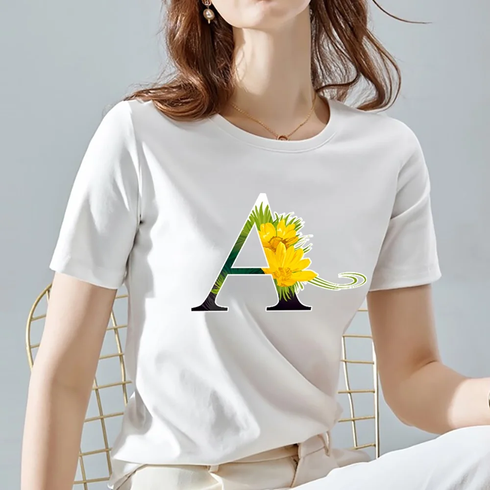 O Neck White Top Women 2022 Summer Casual T Shirt Basic Flower Color Letter Name Pattern Print Short Sleeve Tops Ladies Clothes